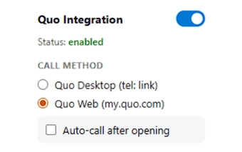 ส่วนเสริมนี้มีโหมดการโทรสองโหมด: Quo Desktop ซึ่งเปิดแอปพลิเคชัน Quo บนเดสก์ท็อป และ Quo Web ซึ่งนำผู้ใช้ไปยังเว็บไซต์ Quo โดยมีหมายเลขที่กรอกไว้ล่วงหน้า ผู้ใช้สามารถสลับระหว่างโหมดได้อย่างง่ายดาย เปิดใช้งานการโทรอัตโนมัติ หรือปิดใช้งานส่วนเสริมชั่วคราวผ่านอินเทอร์เฟซป๊อปอัพที่เรียบง่าย การรวมนี้เป็นส่วนหนึ่งของชุดที่กว้างขึ้นซึ่งรวมถึงฟีเจอร์สำหรับการบันทึกการโทร การซิงค์ข้อความ และการสร้างดีลโดยอัตโนมัติ